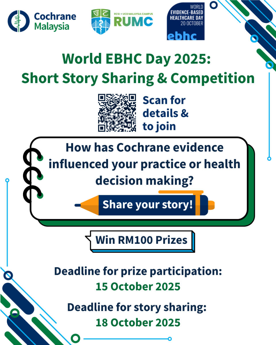 In conjunction with the World Evidence-Based Healthcare Day, Cochrane Malaysia is organizing a short story sharing and competition about “How has Cochrane evidence influenced your practice or health decision making?”. This event involves sharing a personal experience about how Cochrane evidence has influenced their practice or health decision making by writing a short story in the designated online message book.